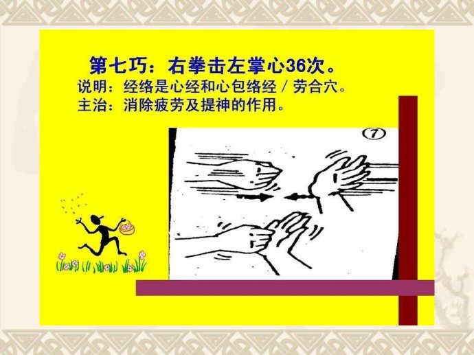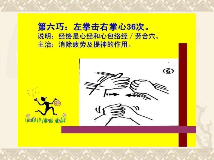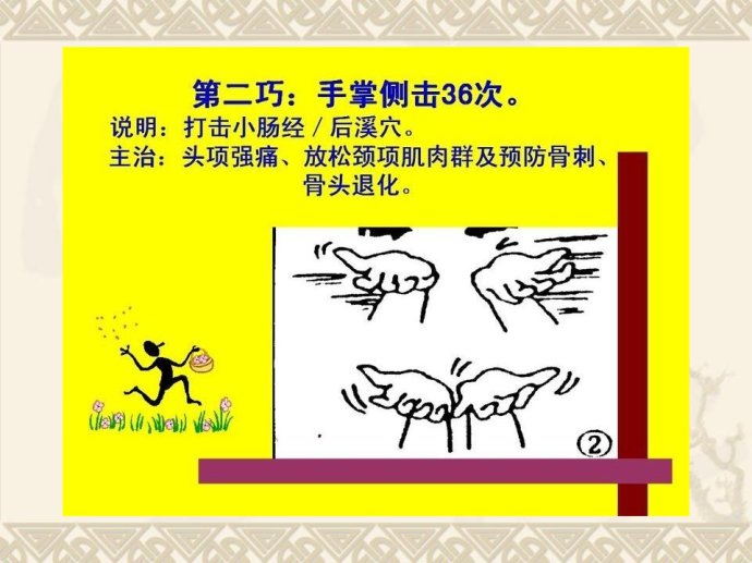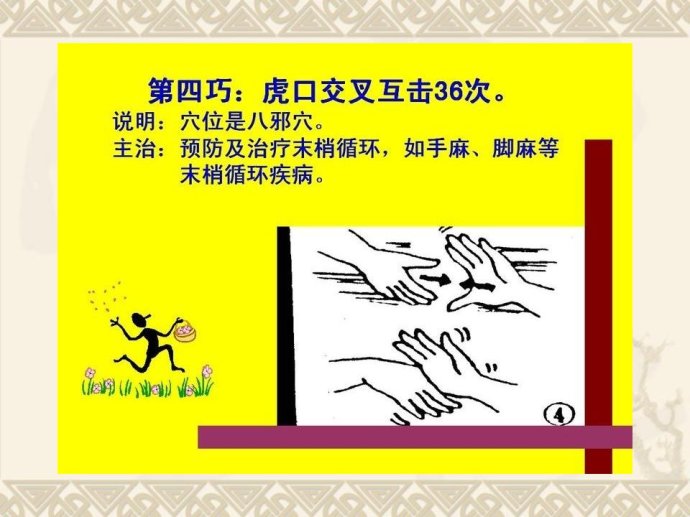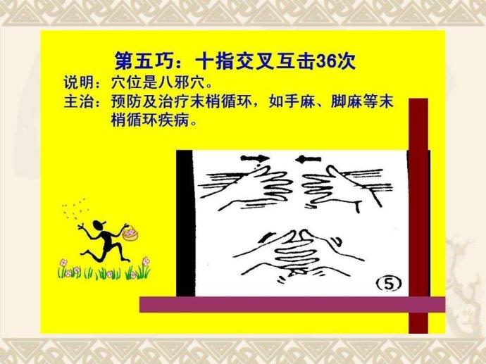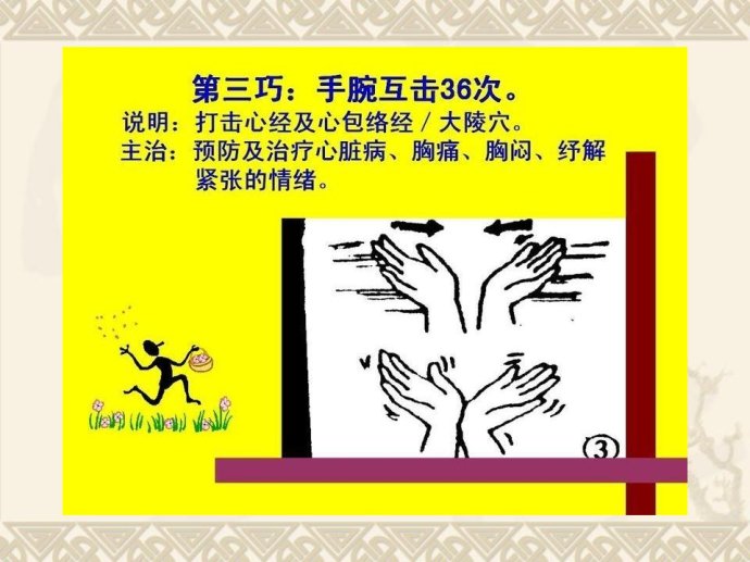 甩手:双手在胸前激烈地甩动手腕约10 秒钟。可以促进手部血液循环。