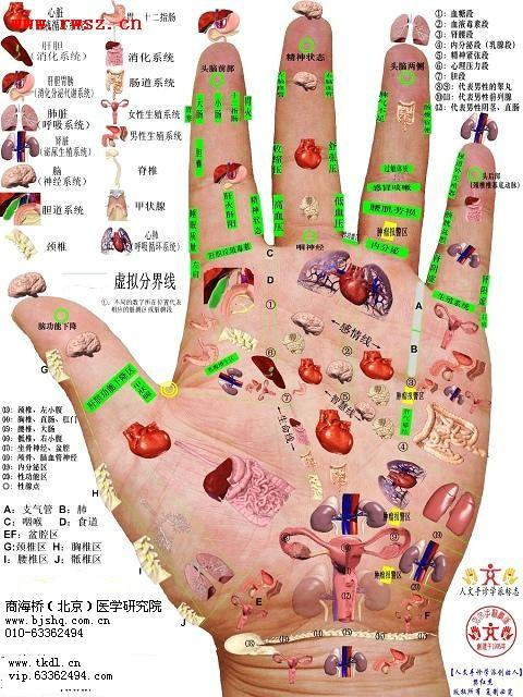 手部有6条经脉循行与全身各脏腑组织、器官沟通。大约有99个穴位(区)可以反映全身五脏六腑的健康状况与全身各脏腑组织、器官沟通。